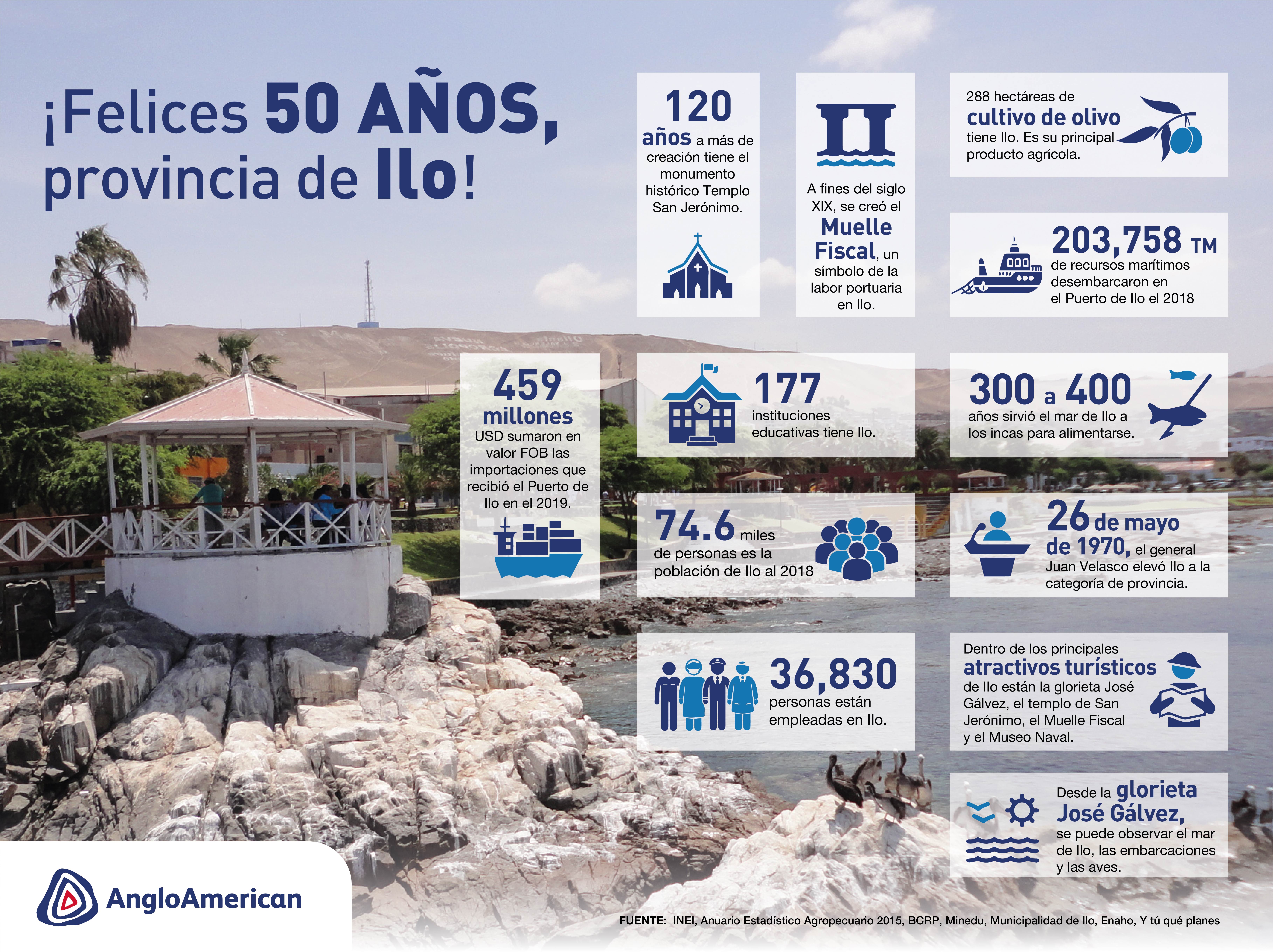 Nos sumamos a las celebraciones cívicas por los 50 años de creación política de la provincia de Ilo. Resaltamos la fortaleza de sus ciudadanos, la belleza de su territorio y la importancia de sus actividades productivas. Ilo posee uno de los puertos marítimos más importantes del Perú y es uno de los puntos que forma parte de la cadena de producción del Proyecto Quellaveco.